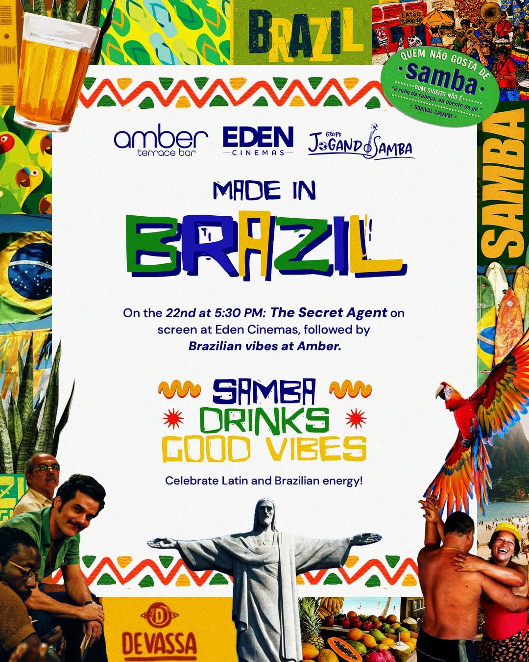 🇧🇷✨ Made in Brazil vibes! ✨🇧🇷 Movies, samba, drinks, and Brazilian energy in one night 🎬🍹💃 On February 22nd, come watch The Secret Agent at 5:30 PM at Eden Cinemas. After the movie, meet us at Amber, just across the road, for samba, drinks, and good vibes 🔥💃🍹 Because really… what’s more Brazilian than enjoying samba on Sundays? 🥁✨ _____________ 🇧🇷✨ Só tem no Brasil! ✨🇧🇷 Cinema, samba, drinks e energia brasileira em uma noite só 🎬🍹💃 No dia 22 de fevereiro, venha assistir The Secret Agent às 17h30 no Eden Cinemas. Depois do filme, encontra a gente no Amber, do outro lado da rua, pra curtir samba, drinks e energia brasuca 🔥💃🍹Porque, vamos combinar… o que é mais brasileiro do que curtir um sambinha no domingo? 🥁✨