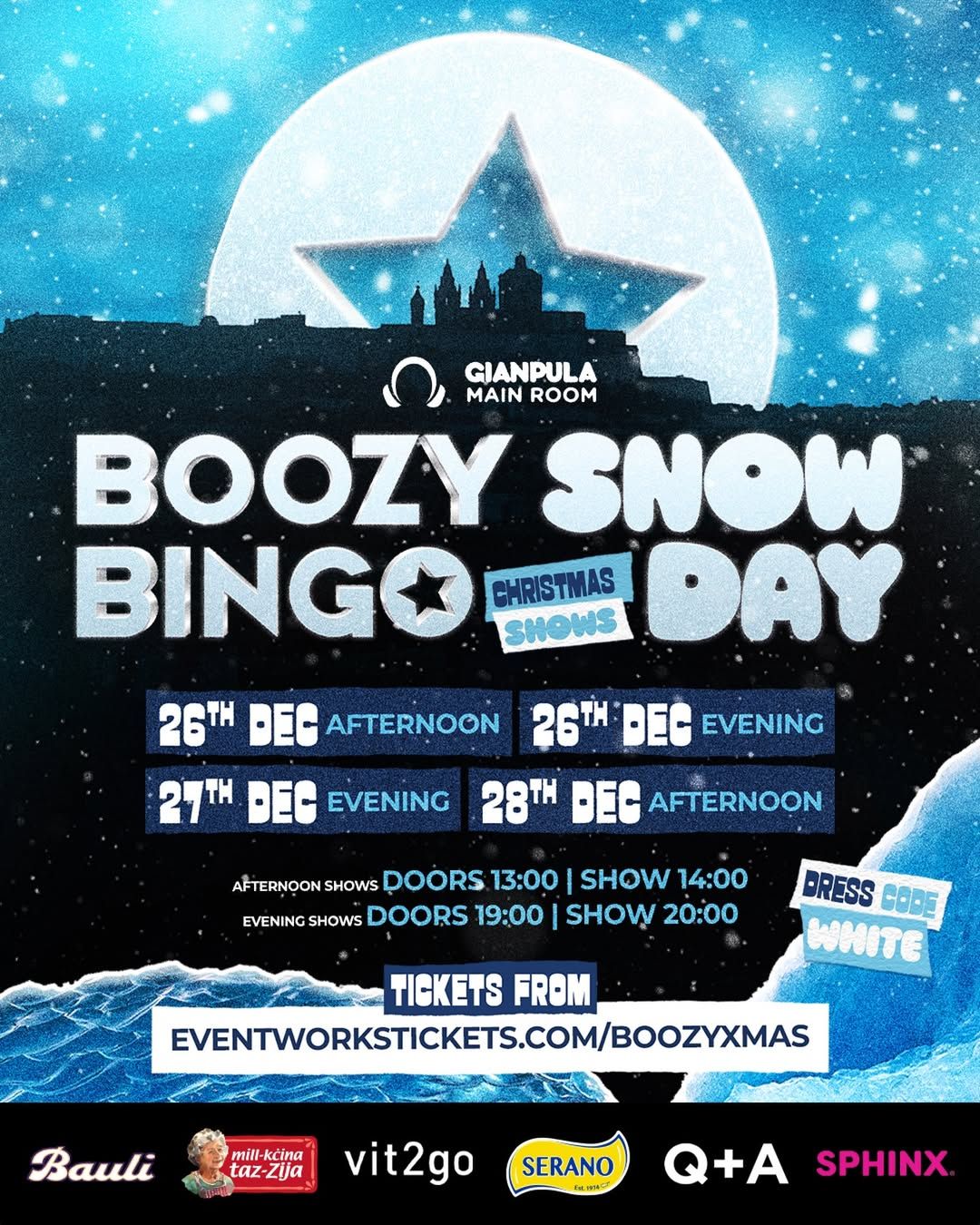 Boozy Bingo pres. SNOW DAY [Christmas Shows] ❄️ This Festive Season [26th - 28th Dec] we’re turning Gianpula Main Room into a full-on SNOW DAY, and you’re invited to the frostiest party Malta has ever seen. ☃️❄️ Enter a snowy wonderland and prepare some ice cold dance moves for a flurry of festive insanity you won’t want to miss. 🎿✨ Whether you're going for Après Chic or Olaf from Frozen, the dress code is WHITE. The costumes are ridiculous, the prizes are outrageous, and the hangover will be historic. 📍 Gianpula Main Room 🕒 26th December Afternoon: Doors 13:00 | Show 14:00 🕒 26th December Evening: Doors 19:00 | Show 20:00 🕒 27th December Evening: Doors 19:00 | Show 20:00 🕒 28th December Afternoon: Doors 13:00 | Show 14:00 Get your tickets NOW or Yule be sorry. 🎟️ Supported by Bauli, Mill-Kċina taz-Zija, vit2go, Serano, Q+A and Sphinx. Tag your squad, sort your frosty fits, and don’t be late: Boozy waits for no one. 🛷