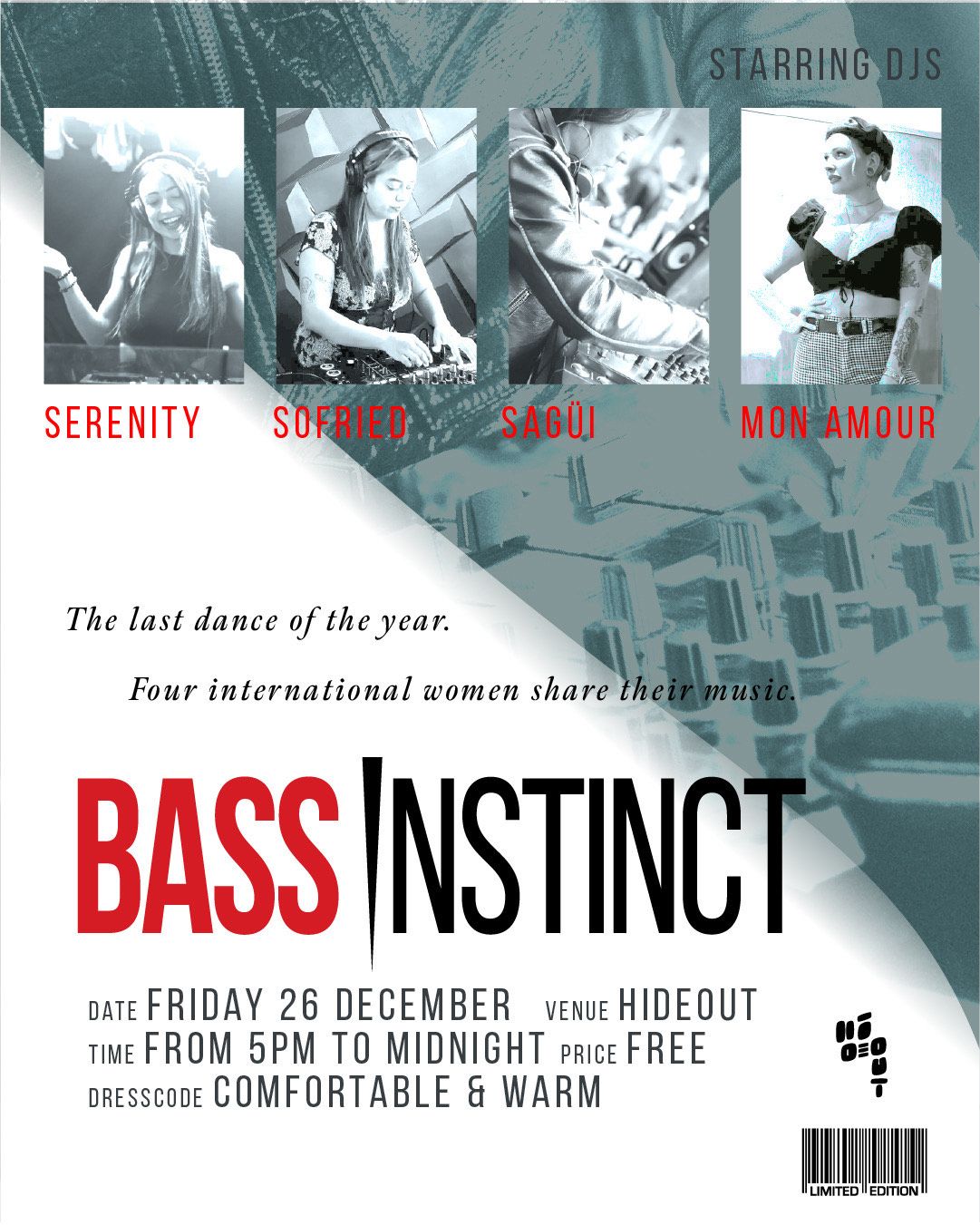 BASS INSTINCT – The Last Dance of the Year Four talented women, each bringing their own background and style, take over the decks, guided by groove, instinct, and movement. Line-up: Serenity · Sofried · Sagüi · Mon Amour From deep and minimal house to acid-driven rhythms and a high-energy closing groove. 🗓 Friday, 26 December 🕔 5 PM – Midnight 📍Location: Hideout ✨ Free entry